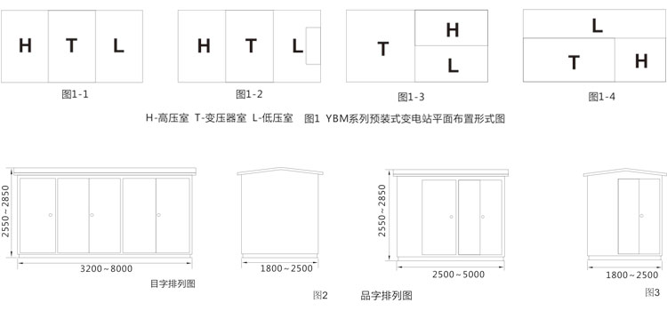 YBM系列預(yù)裝式變電站,根據(jù)排列方式分“目”字形排列(圖1-1、圖1-2);“品”字形排列(圖1-3、圖1-4)。外形尺寸見圖2、圖3。
