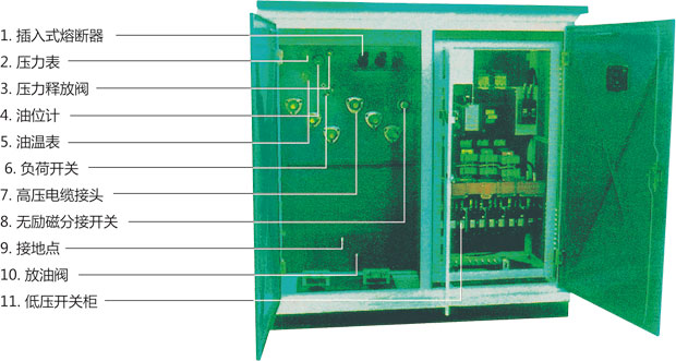 該產品將高壓負荷開關、高壓熔斷器置于變壓器油中,具有與變壓器器身共箱或分箱兩種結構形式。油箱采用全密封結構,配有油溫表、油位表、壓力表、壓力釋放閥、放油閥等元件以監(jiān)測變壓器運行狀況。該產品分為環(huán)網型、終端型及電源型供電方式。為了使此種產品更適合于我國電網的實際要求,公司又推了插拔型干式熔斷器,熔絲的熔斷不影響變壓器油的性能。根據低壓饋出要求的復雜程度,YBM-12/0.4型產品分為標準型、加強型和綜合型三種外殼形式,使用戶和設計單位在選型時,做到更靈活、更經濟。
